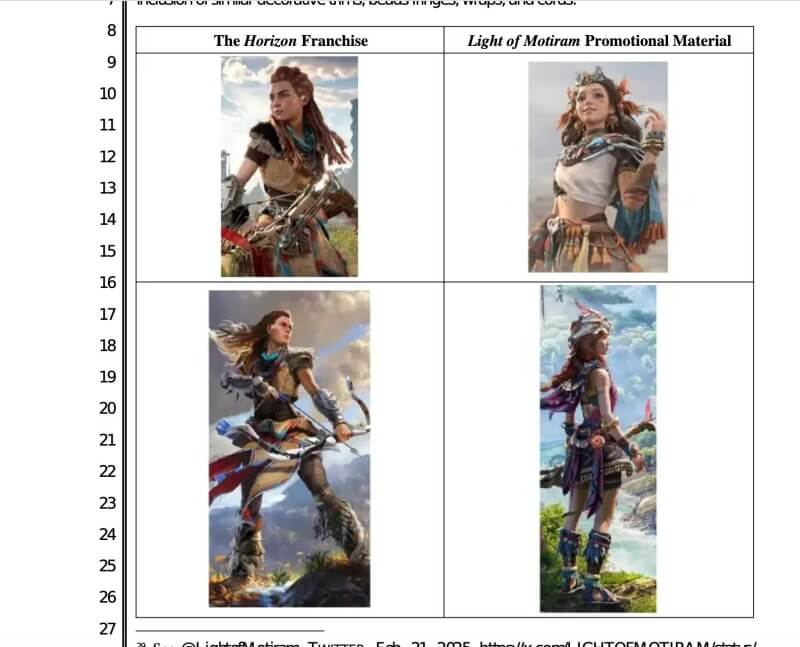 The lawsuit aims to prevent the release of Light of Motiram, developed by Polaris Quest, and is chock full of examples Sony pulled to show its resemblance to the Horizon series. It includes side-by-side comparisons of art and designs, screenshots of Steam users calling Light of Motiram a copy of the Horizon games, and cropped out article headlines dubbing the game a rip-off. A quick visual perusal will show how uncanny some of the parallels are; for instance, both games are set in a techno-nature apocalyptic future where tribal groups fight against strikingly animal-like robots and feature a young, red-headed huntress character as the protagonist.